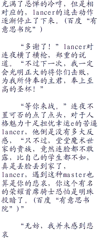 回首看向了菲欧娜和爱丽斯菲尔所处的位置,无双的剑姬正与被令咒控制了的lancer战斗拖延着,同时还要庇护爱丽斯菲尔被比如卫宫切嗣或是卫宫切嗣亦或是切丝papa这样子的人物偷袭。所幸saber和rider即使不是傻到了帮助‘敌人’的servant,但也不会是那种不会落井下石的诡谲人物。在数千年的历史上留名下来的千古风、流人物,自然有其令人钦佩之处,连夜都不觉得自己人格魅力,能够比这些家伙还要来得出众。