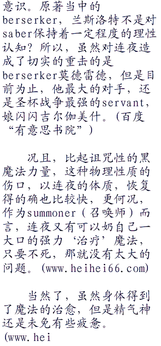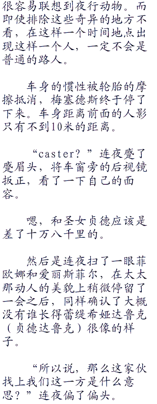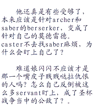 “是吧!是吧!”caster晃乱了头发,又哭又笑,两手紧紧地抱紧水晶球,用额头顶住那冰冷的水晶球表面,不顾一切地用炙热的视线盯着球中浮现的少女面容。“呜呼、贞德、我的圣洁处女我马上就会去见你。请无论如何也要等我!不过在那之前,请允许我为您取来您的宝具奉上。胆敢亵、渎圣女的人,必将由我吉尔斯&a;a;#6;德&a;a;#6;莱斯亲身为汝将其讨伐!”