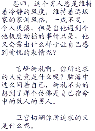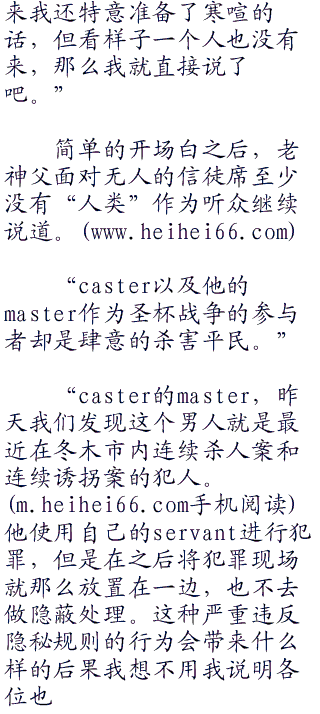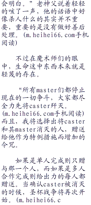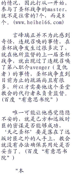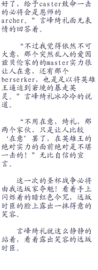发出招集ster的信号之后一小时左右。没有一个ster出现在冬木教会,取而代之的是六个使魔在这里齐聚一堂。除了表面上退出战争的言峰绮礼和看不到魔术信号的caster的ster龙之介以外.其他的ster都派“代表”来了。看来把所有的ster都算上,大家都不在乎表面上对教会的态度。