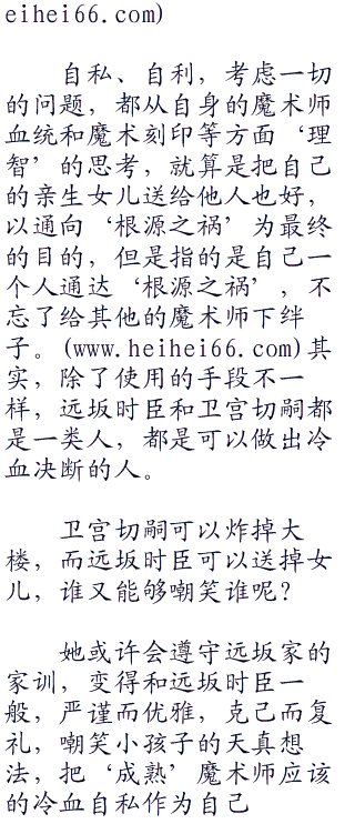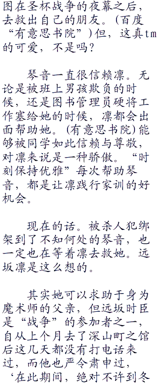 如今相继发生在冬木市儿童诱拐事件,无法通过单纯的搜查活动解决。即使报了警,孩子也很难回来了。学校的老师、琴音的亲人和朋友一定没有意识到这点,只有凛知道,凛自认也只有自己,才能够帮助琴音。