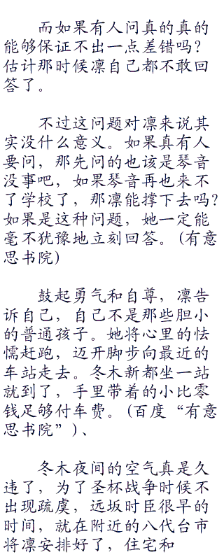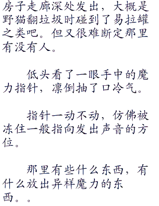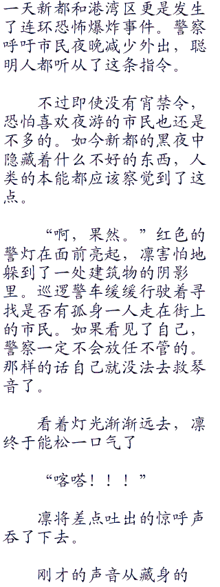 想到今天私自外出无法隐瞒,之后回来的晚上,保姆一定会严厉批评自己时,甚至是搬出远坂时臣这个严苛的父亲出来时,凛对自己说,自己偷偷溜出来不是为了什么见不得人的事,而是因为自己身为远坂家族的一员,才必须这么做的。回去的时候一定要带琴音一起回去。那时无论长辈怎么骂自己,心里一定还是在为自己的行为感到骄傲的。