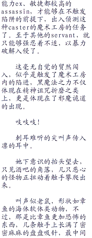 不,或许是作为魔术师的工房,这里附加上了大量的魔术法阵,以欺瞒了普通人的视线,所以能够抵达这里,恰好是被龍之介诱拐进来的小孩子,亦或是像远坂凛这样,具有一定魔术能力的魔术师潜在能力者。
