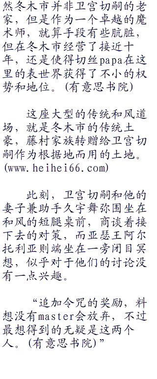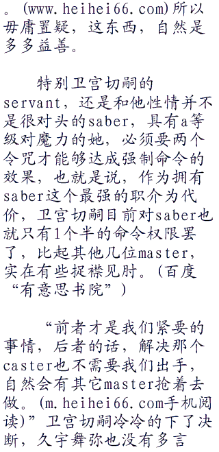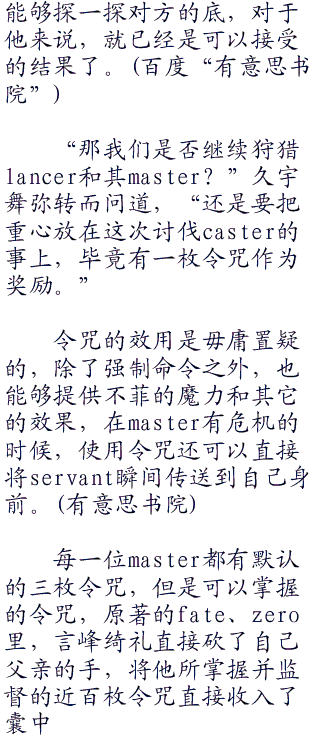 assassin的战地obc(观测者)身份,监视参与圣杯战争的每一位ster和servant的动向,a级的气息遮断效果?比起命运这完全‘作弊’、‘出老千’的能力来说,简直跟无机质的摄像头差不多,所以,命运即是平常魔术师无法企及的‘魔法’的奇迹。