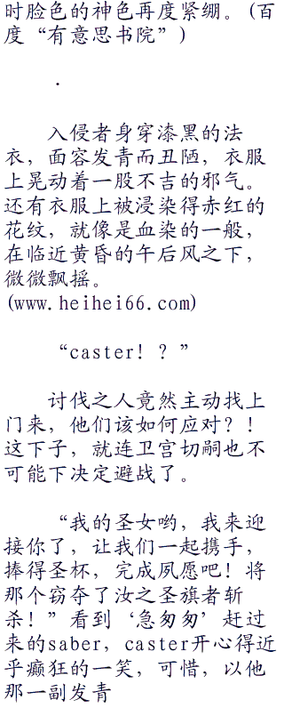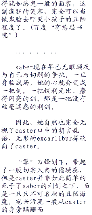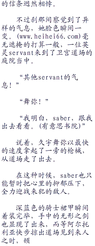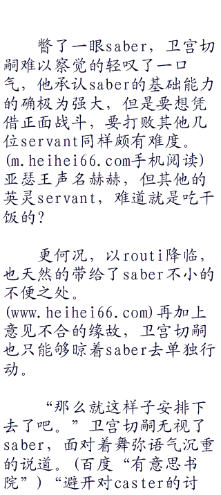 但是说起来,这一次圣杯战争给予人的惊奇之意也已经是屡见不鲜了,超过7位、违规召唤的servant,骑士王saber并非是灵体,而是以切实的routi被圣杯召唤而来,现在assassin这个弱小的职介,似乎其中也有不少的诡道。