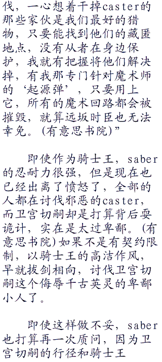 “你这是对英灵的侮辱!为什么不让我去正面战斗!?非要自己用卑鄙的手段去偷袭!你难道就这么不信任作为从者的我吗?正面抗衡的话,我亚瑟王绝不会畏惧其它英灵!”