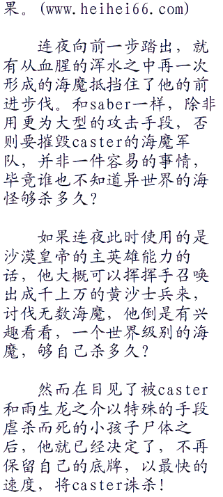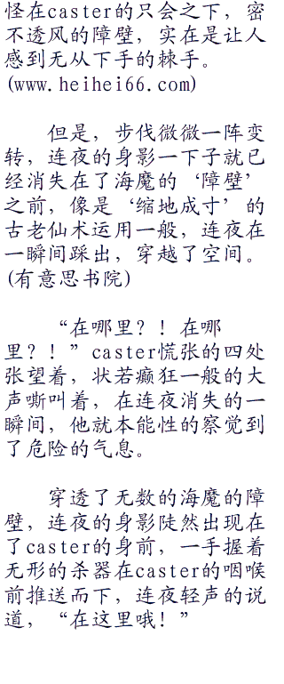 擒贼先擒王,这个道理无论何时在群体作战的时候都是卓有成效的,特别还是对于caster这种本身身体能力羸弱,只依靠着自己召唤出来的海魔的羸弱召唤师。