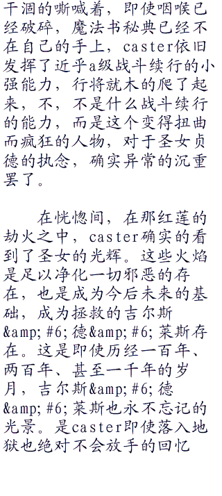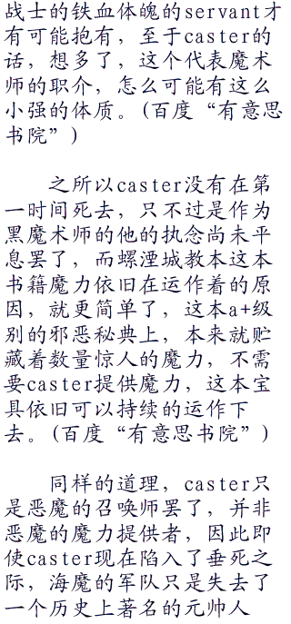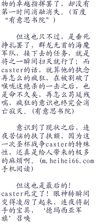 本来连夜以为这割喉的一击,足以将身体比较羸弱的caster直接斩杀于此的,虽然他一向知道英灵servant也不是那么简单容易的就会死去的,但是caster这种羸弱的魔术师的职介,总不可能有‘战斗续行’的小强能力吧。