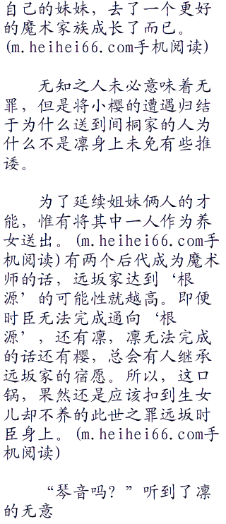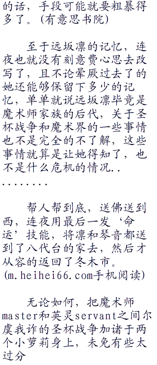 连夜不由得在心里默默吐槽,其实也并不是凛不挂念小樱,只是她一开始也并不知道小樱的遭遇会如何,也不知道间桐家的魔术机理是如何使用的,只是以为