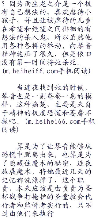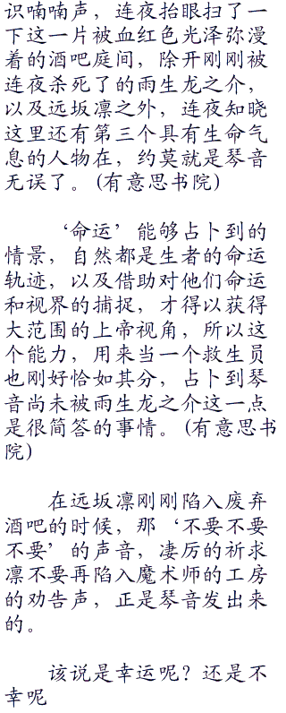 在无意识的惊寐之下,远坂凛喃喃的说着自己好朋友的名字,她之所以提起如此大的勇气,违背父亲远坂时臣的要求,从八代台市来到了冬木市,就是为了救出可能失踪来到好“零零零”朋友琴音的,即使是在这极度危机的情况下,她依旧还在念叨的挚友的名字。