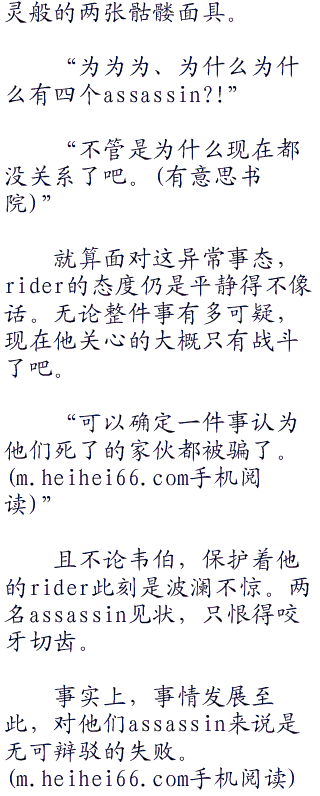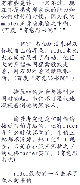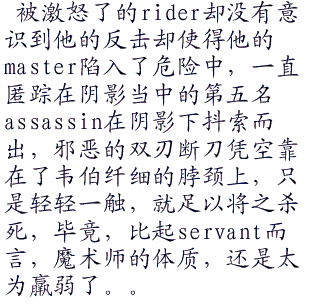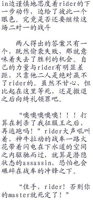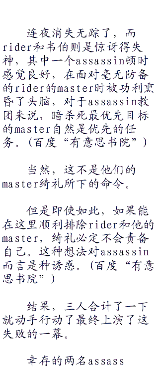 行程结束,连夜本来打算直接返回爱因兹贝伦的别墅的,却不无意外的发现了assassin教团和rider之间的战斗。