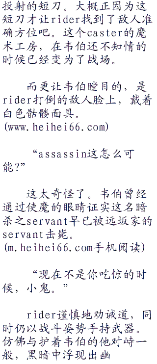 另外的还有saber的ster也就是切丝papa和肯尼斯肯主任两人之间的斗智斗勇,saber实在是想错了,肯尼斯之所以派遣lancer前去援助她讨伐caster,并非他大事的决定上没有犯糊涂,而是转而偷偷的前去偷袭卫宫切嗣。