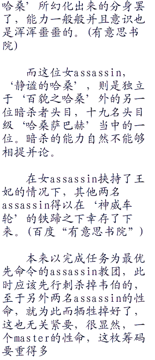 就算是assassin教团当中的复数位assassin,也有普通的小喽啰和暗杀者头目之分的。确切来说,那些普通的复数位assassin,都只是‘百貌之