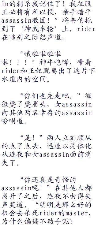 应该说是没有预想到竟然还有第五位assassin呢?还是说这第五位的女assassin有其特殊之处,rider竟然没有觉察出她的动作。