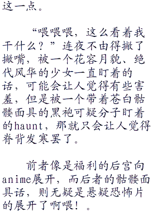 而紫发的女assassin,她的愿望和其他assassin教团的暗杀者,都不一样。不是为了切实的完成暗杀任务,不是为了能够再享受一次俗世的人生,而是,为了找到能够触碰自己的存在。