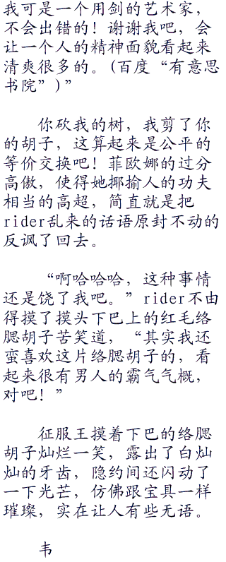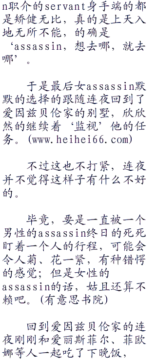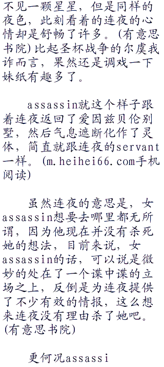 女assassin没有说话,大概是极为震惊之后不由得细细的打量着连夜,以及回味着自己终于找到了会无视了‘妄想毒身’的毒性的家伙。遵循圣杯的召唤而来,女assassin所想要寻找的,就是这样子的人啊!