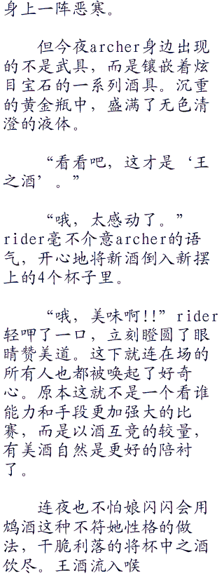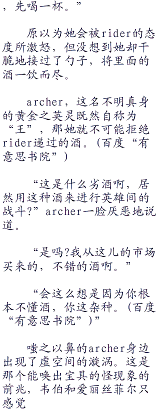 “杂种,不要用你的思维来衡量我的能力。”身穿甲胄的archer用红玉般的双眸傲然注视着rider。“要是论坐骑,我的坐骑也是天底下最为卓越的御座!”