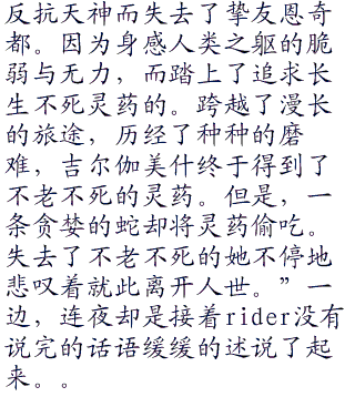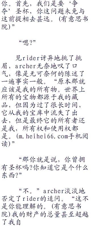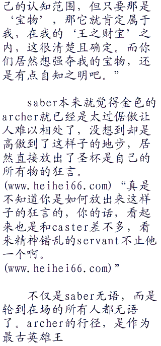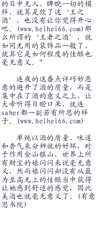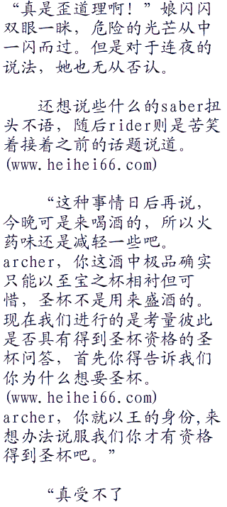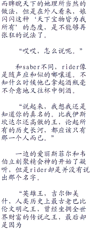 archer嗤笑着看着充满火药味的saber。“不像话,连酒都不懂,这种最为基本的享受都不懂的家伙才不配做王。”