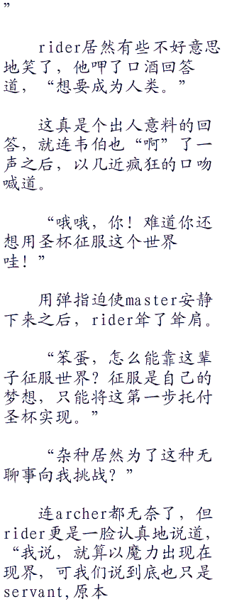 “哎,怎么又吵起来了,不是说了吗,今晚是论辩王者之道,看看谁才是最适合捧走圣杯之人。况且,英雄王,连夜所说的话也应该全部属实的吧,并没有什么可以的贬低你的程度。”一边的rider再度充当起了和事佬,劝说起了已经开始了一言不和而对峙的两人。