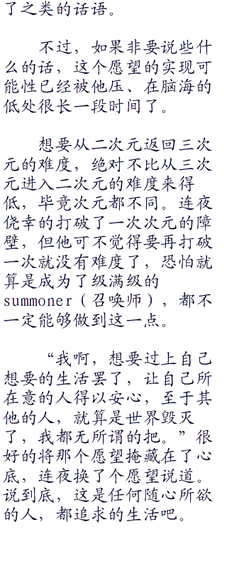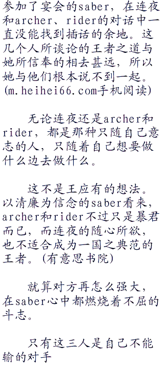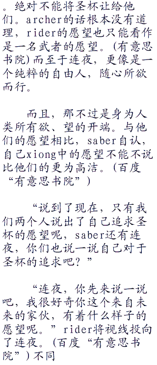 “因为这是‘征服’的基础。”伊斯坎达尔注视着自己紧握的拳头呢喃道。“拥有身体,向天地进发,实行我的征服那样才是我的王者之道。但现在的我没有身体,这是不行的。没有这个一切也都无法开始。我并不恐惧什么,我只是觉得,我必须拥有**。”