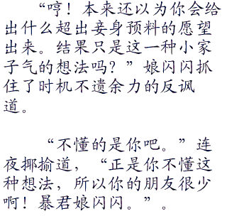 “呵呵,现在还说这种话。你也趁早做好觉悟,不光是圣杯,我还打算把你的宝物库洗劫一空哪。如此的美酒让征服王喝到了,你可真是太大意了。”rider粗狂地大笑起来。