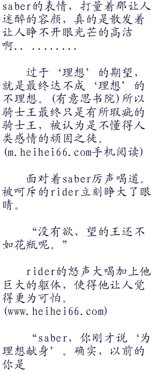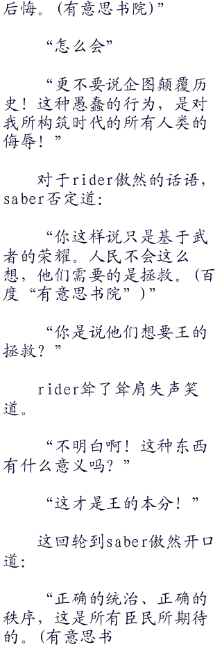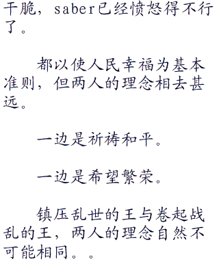 与不停嘲笑saber的archer不同,rider从根本上否定了她。saber锁起双眉,用锋利的语气反驳道: