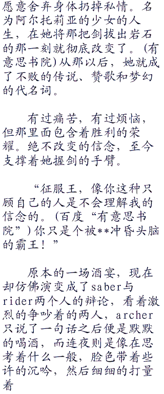 回答archer的是rider渐渐深沉的沉默。这对saber来说,与被嘲笑是同样的侮辱。“我不懂有什么好笑的。身为王自然应该挺身而出,为本国的繁荣而努力!”