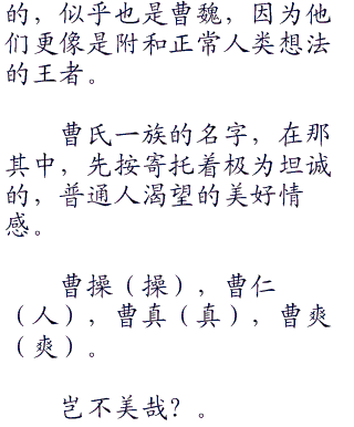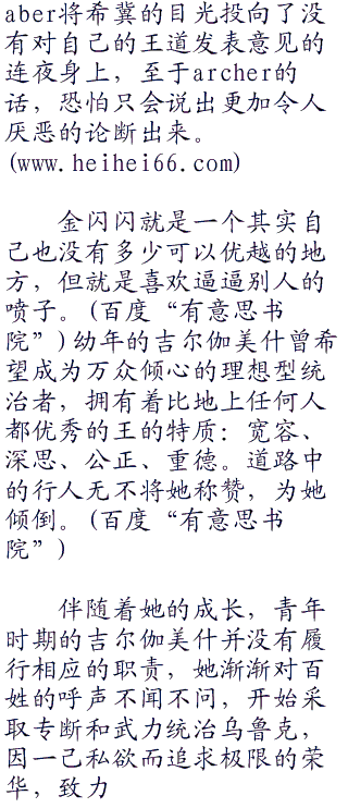 “你一味地‘拯救’臣民,却从来没有‘指引’过他们。他们不知道‘王的**’是什么。你丢下了迷失了的臣民,却一个人以神圣的姿态,为你自己那种小家子气的理想陶醉。