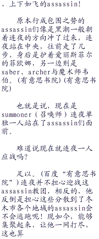 连夜一戟划下去究竟能够阻止多少个身体矫健的assassin?不,不是能够阻止多少人的问题。此时哪怕漏过一人,那一人也可能对爱丽丝菲尔造成重大创伤。