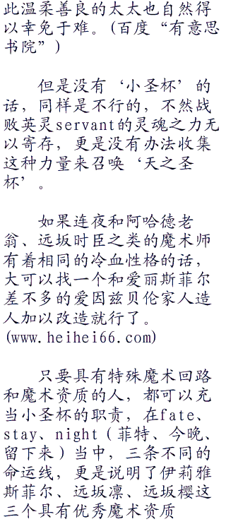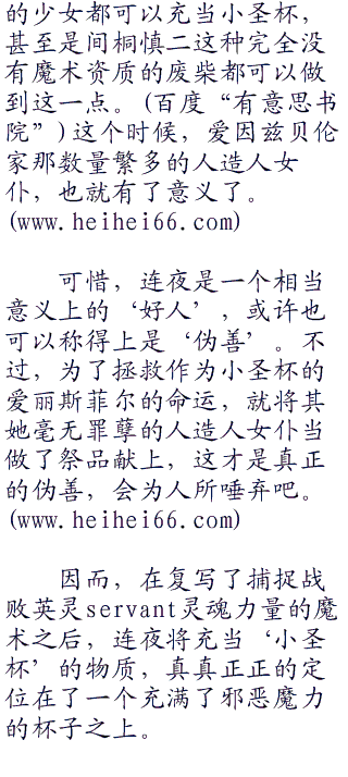 而之前的圣杯战争当中,用以充当小圣杯,承载战败英灵职介灵魂力量的,都是爱因兹贝伦家的人造人。没有什么,是比起精心构筑的人造人,更加适合承载灵魂之力和魔力的了。