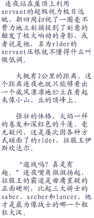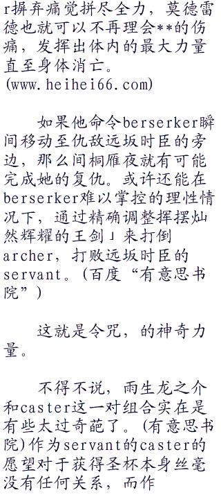 连夜不由得蹙了蹙眉,莫德雷德变成了狂气的berserker,就足以证明这一点了。一般来说,作为使用丧失理智的漆黑魔力而强化的职介,会成为berserker职介而降临的英灵,自然有其原因。