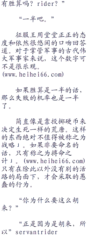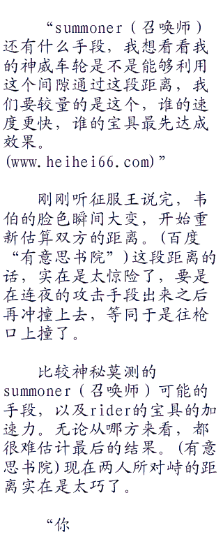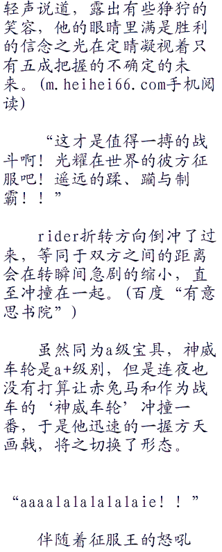 “嗯,即使是对我的ster你,我也必须先声明一句。”好像看透了韦伯的疑问,rider露出了无敌的微笑,然而视线仍然没有从冲锋的彼端身上移开,对身旁的少年说道。