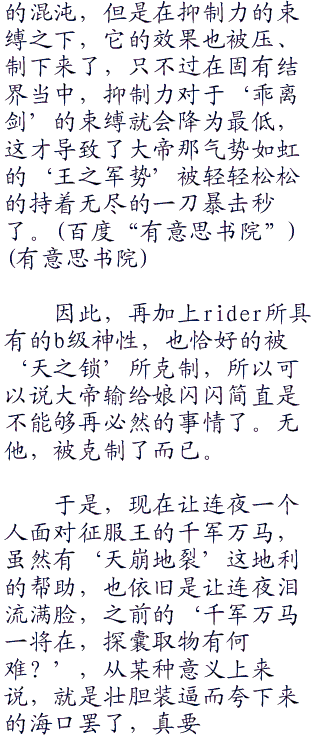 更不要脸的是冲锋在前的降临,有马其顿王国的军神,有马加拉王,都是那个时代的王者,哪一个不是单纯令基础能力而言超过了rider的英灵的servant。