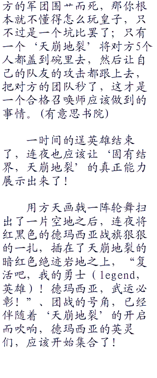 所以,‘固有结界,天崩地裂’本身最大的能力,实则并非单纯只是环形的地狱火山群,以及那种压抑的死亡枯寂感,而是,,在那之后追加的,名为‘希望’的可能性。倘若‘固有结界,天崩地裂’的确是连夜内心隐隐所追求的心像而化成了的话,那么,它绝对不可能就是这样一片绝灭的道路罢了。