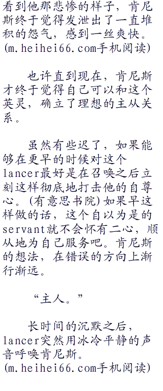 由于肯尼斯说得太过份了,lancer无话可说。凯奈斯看着他的样子心中暗暗体会到一种施虐的快感。趁此机会,他把再次刻上了令咒图案的右手伸到lancer面前,魔术师自豪地高声笑道。
