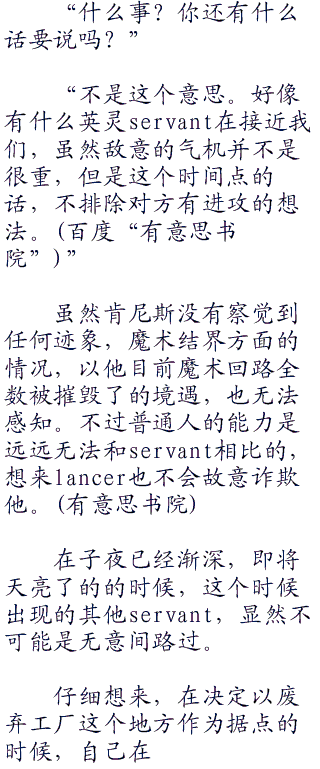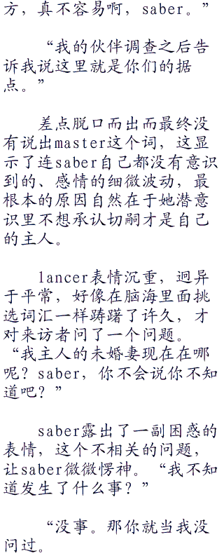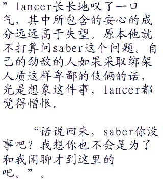 “自不量力的傀儡。不管怎么说你只是servant而已。你只不过是通过魔术方式而得以停留在现实世界的影子而已!你所谓的荣誉与自豪充其量只是亡魂迷惑世人的伎俩而已。更何况你竟然还要狂妄到要对主人说教的地步,自不量力也要有个限度!”