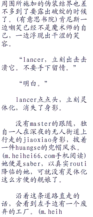 “肯尼斯殿下”lancer面对高声嘲笑的凯奈斯,无力地垂下了头,无法进行任何反驳。曾经在群雄面前舞动双枪的霸气,早已经消失得无影无踪,无论是从无力垂下的肩膀,还是从凝视着地板的涣散的双眸,根本看不出来任何英勇的痕迹。