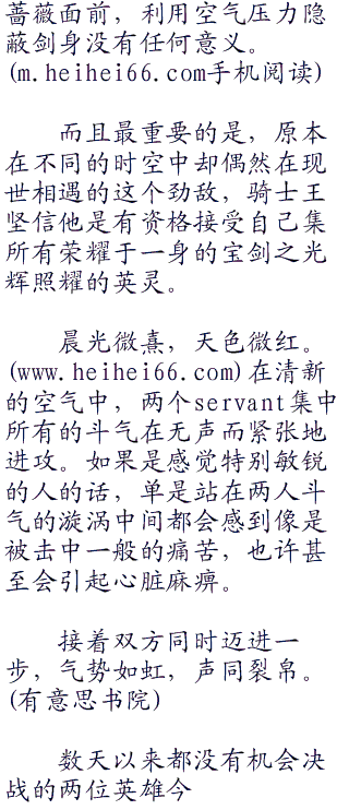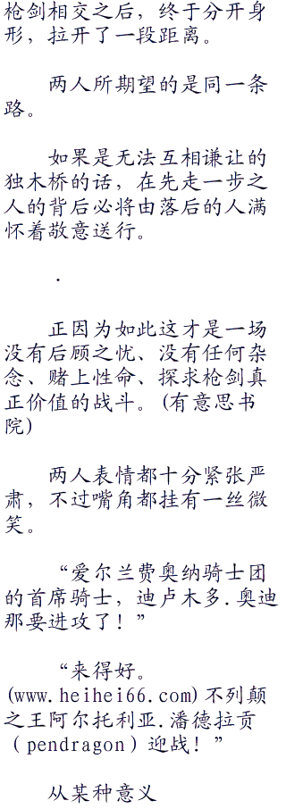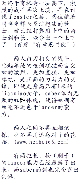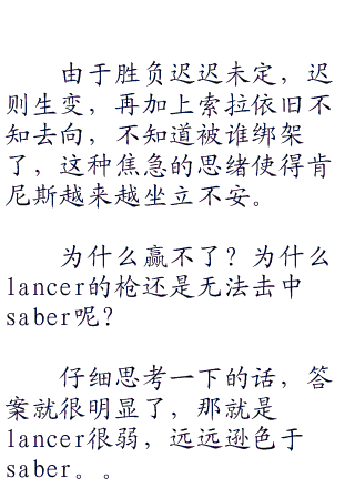 因为内心忧虑而失去了平常俊美表情的lancer,此时终于露出了一丝微笑。“saber现在能给我的内心吹来一股清爽凉风的,就只有你这没有任何杂念的斗志了。”