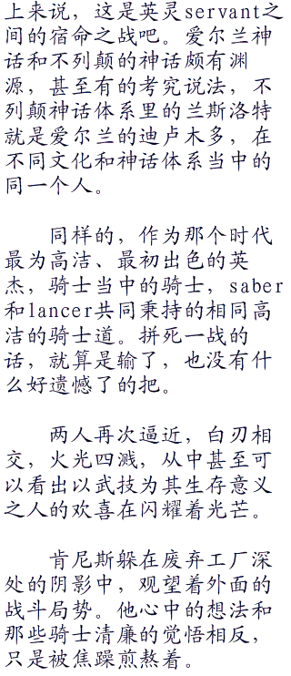 “天已经快亮了,但夜晚还有一点时间,如果错过了这次大好机会的话,不知道何年何月我们才能再有机会像这样毫无任何顾虑地决一胜负。我不认为该错过这次机会你觉得呢?lancer。”