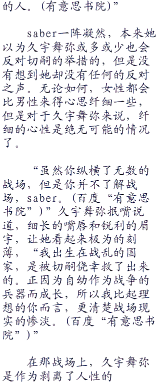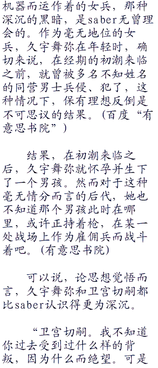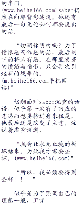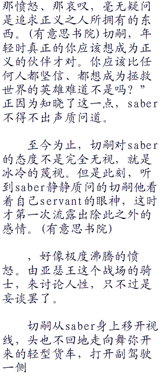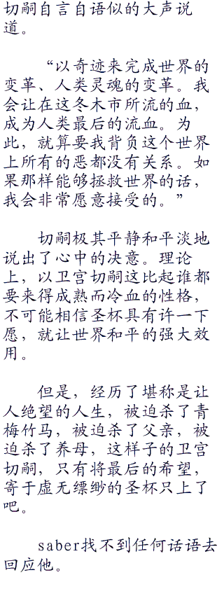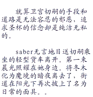saber回想起消失的lancer最后的怨怒目光。接着,她一动不动地凝视着倒在血泊之中那对男女的悲惨尸骸,以及刻在其面孔上的痛苦表情说道。“就算是那样,你,就没有一点人性可言吗?”