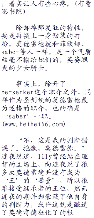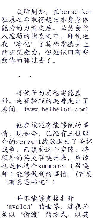 苏醒过来了的berserker第一时间盯上了的,理所当然是连夜了。不过这一次,她就没有像之前那样子发狂了。或许莫德雷德的确对连夜抱有什么非分的想法,而berserker职介特有的摧毁理智的狂暴,则是将这种想法放大和扭曲了数倍。