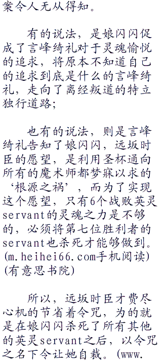 在时臣渐渐失去温度的尸体旁边,忽然涌动起一阵璀璨的气息,闪耀着灿烂光芒的黄金之servant实体化出现在绮礼的面前。