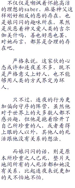 确实,这个家伙是无法把自己的性命托付给她的危险角色。这可以说是与恶魔签定的契约。既没有仁义也没有忠诚,甚至连利害关系都很难判断,专横残暴的servant。
