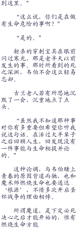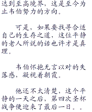 在圣杯战争即将迎来终结的,自己不得不硬着头皮配这个毫无关系的老人,韦伯不禁感到愤慨,可是,因此而争论的话只会让时间拖得更长,就算不是那样,被问起早上回来的原因,自己也会陷入无言以对的境地。结果,韦伯只好朝老人所在的屋顶走去。
