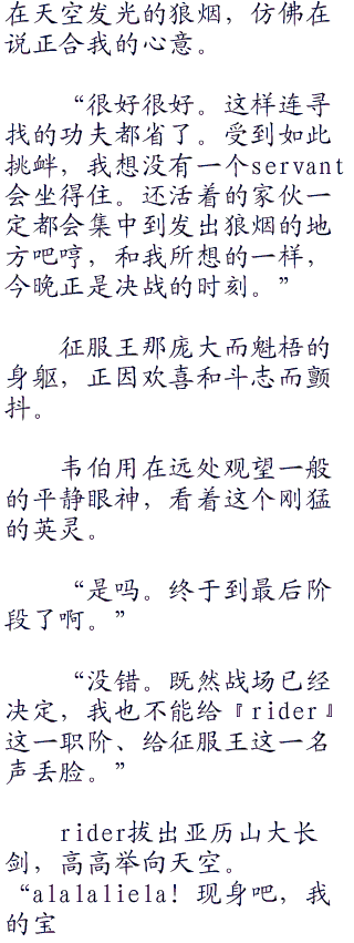 已经实体化的rider早已做好完全的战斗准备,正在翻阅着荷马诗集。