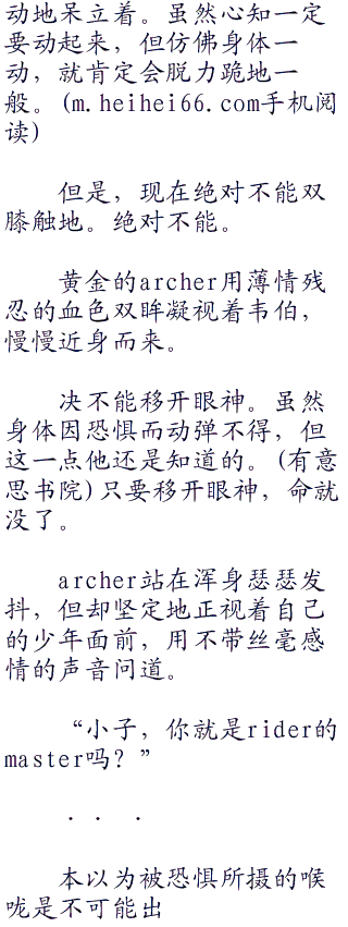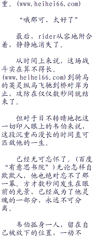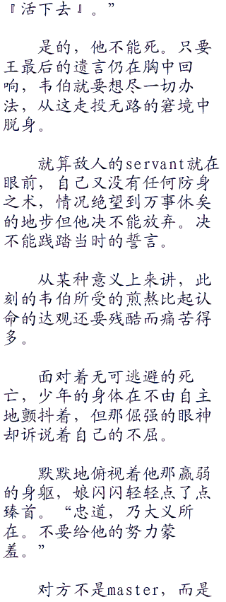 亚历山大之剑没能触到对方。有的只是,吉尔伽美什的乖离剑贯穿伊斯坎达尔胸膛的这一事实,和剑身在肺腑间转来转去的感触。真是把怪剑。征服王如同事不关己一般感言道。