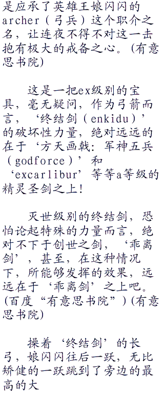 特别是连夜曾经趁她难以支拙的时候,将她拍飞了出去,让她陷入了最为难堪的境遇,逼得娘闪闪不得不拔出了一直放在背上,当做了最终杀手锏的宝具,终结剑(enkidu)。