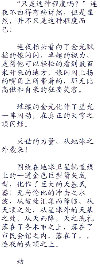 但是连夜可不知道这件宝具的真名解放会是什么能力,反正大抵不会是娘闪闪那家伙从穹顶之上跃下来,双持着终结剑战刃,和自己战一个痛快。