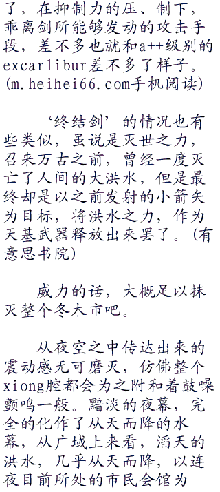‘终结剑’的效果是召唤圣经里的灭世洪水为原型,滔天洪水从天而降,虽然听起来没有能够开天辟地的ea(乖离剑)霸气,但是毋庸置疑的是,创世之力和灭世之力,同样显得无比的可怕。