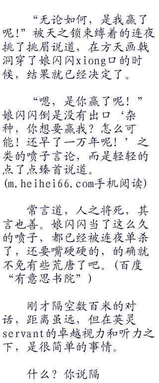 在最后一刻,rider挥砍而下的亚历山之剑定格在了娘闪闪的头顶上,而“零零零”在连夜这里,在最后的一瞬间,方天画戟却已经刺破洞穿了娘闪闪的xiong口。