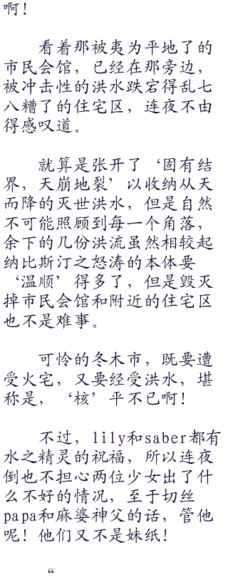 娘闪闪这一发‘终结剑’,几乎要毁灭掉整座冬木市,将所有无关联的可怜人牵扯致死也无所谓的行径,的确也只有她这个位于人之极的最古之王才能够做到了。